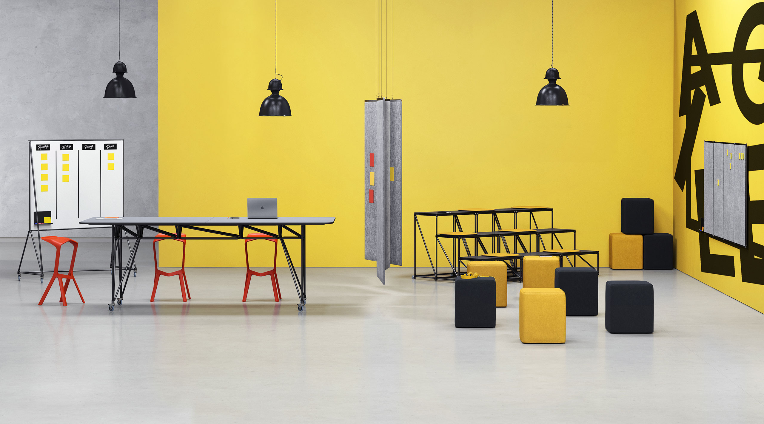 Eine flexible Ausstattung für unterschiedliche Präsentations- und Arbeitsmodi, Prototypen, Muster und andere Artefakte schaffen eine Atmosphäre des „Work In Progress“. Ein flexibler Arbeitstisch in Stehhöhe, leichte, stapelbare Hocker und genügend Schreibfläche, um Ideen festzuhalten, zu bewerten und zu priorisieren, bilden die Grundausstattung. Mit einem TV-Monitor und Präsentationstechnik können außerdem Infomaterialien eingespielt oder externe Diskussionspartner